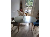 White gloss dwell dining table with 2 chairs, measuring 129cms in diameter and 70cms high.